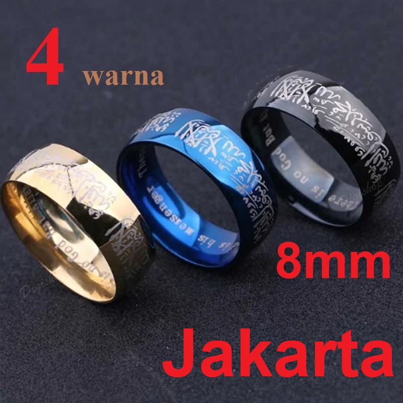 8mm Cincin Tauhid Muslim Pria Wanita Anti Karat Warna Emas Biru Silver Hitam Islami Kaligrafi Hadiah