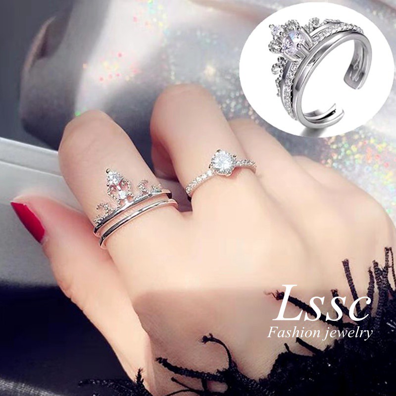 2Pcs / Set Cincin Titanium Wanita Mahkota Berlian Emas Ukuran Disesuaikan Korea Aksesoris