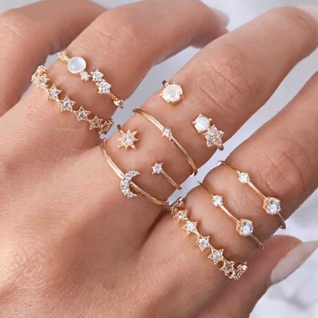 Kekurangan - Kekurangan membeli BYSTESI 9pcs Rhinestone Moonstone Star Gold Ring Set | Cincin Wanita Set Emas di Toko ini