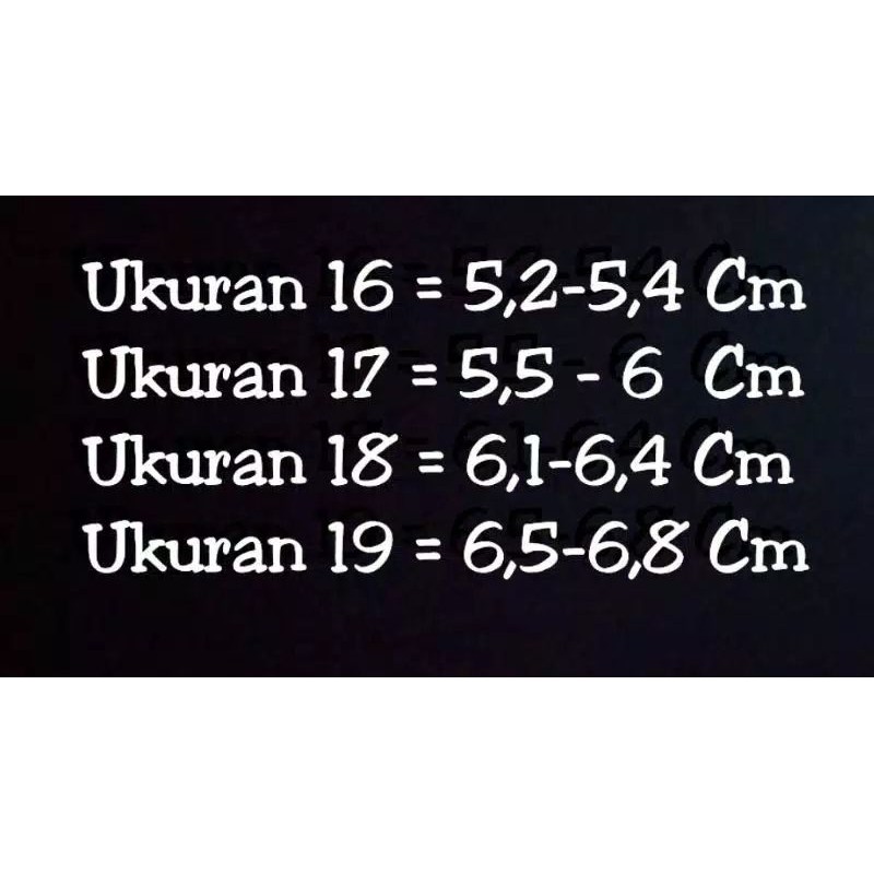Produk ini memiliki 4 Variasi Ukuran yaitu : Size 16 (5,2-5,4 Cm),Size 17 (5,5-6 Cm),Size 18 (6,1-6,4 Cm),Size 19 (6,5-7 Cm),